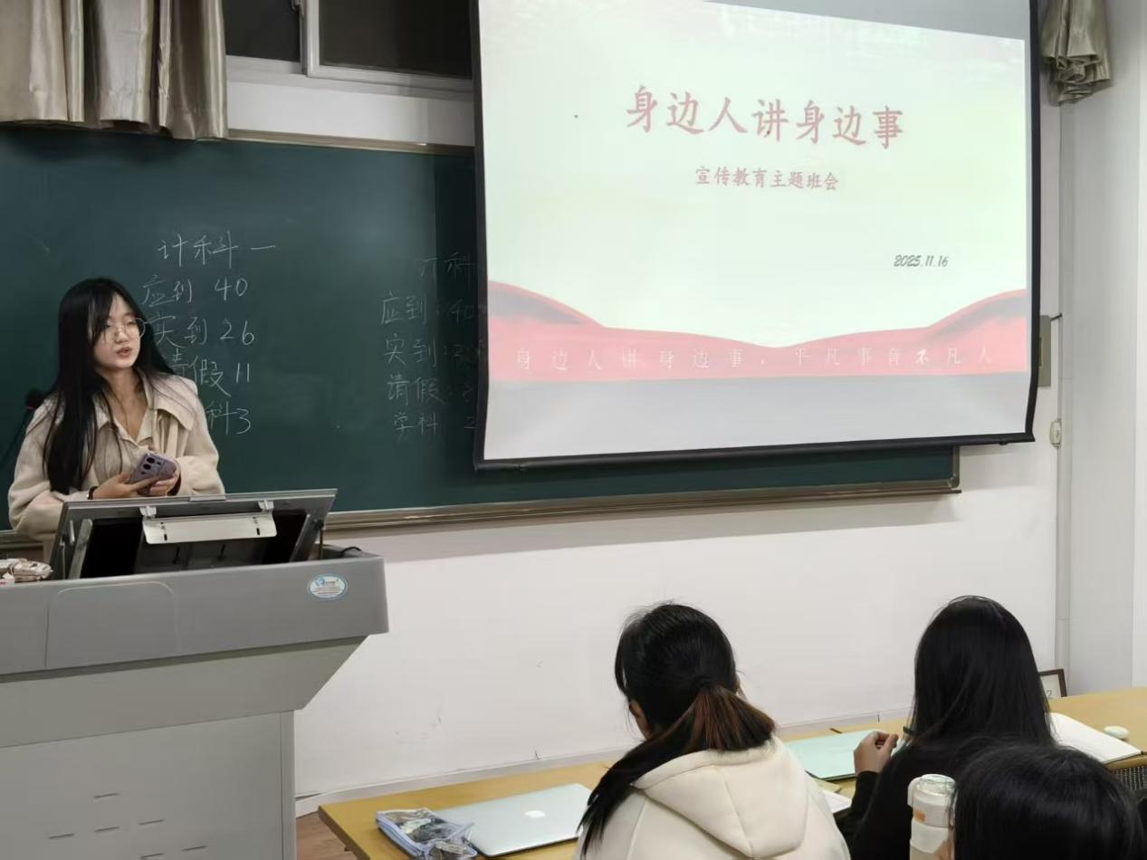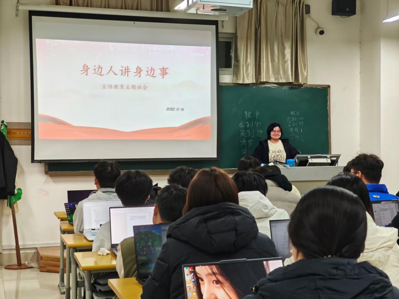 活动中,各班宣传委员牵头组织,邀请班级内在学业科研、志愿服务、社会实践等方面有突出表现的学生分享亲身经历。分享者结合自身故事,讲述成长感悟与责任担当;现场学生认真聆听、积极互动,不时报以热烈掌声。学生们表示,身边人的真实故事更具感染力,让人深受启发、备受鼓舞。