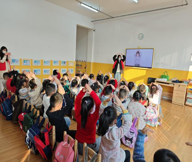 活动现场,志愿者们提前布置场地、调试设备,通过“击鼓传花”等趣味游戏暖场,迅速拉近与幼儿的距离。在感恩导入环节,志愿者用通俗的语言引导孩子们分享感恩对象,播放《感恩的心》原版歌曲让幼儿感受情感内核。随后的歌曲教唱中,志愿者逐句教唱并结合拼音释义,通过分组对唱、贴纸鼓励等方式,帮助幼儿熟悉歌词;手势舞教学则将动作拆解示范,一对一纠正姿势,带领幼儿边唱边跳,反复练习磨合。