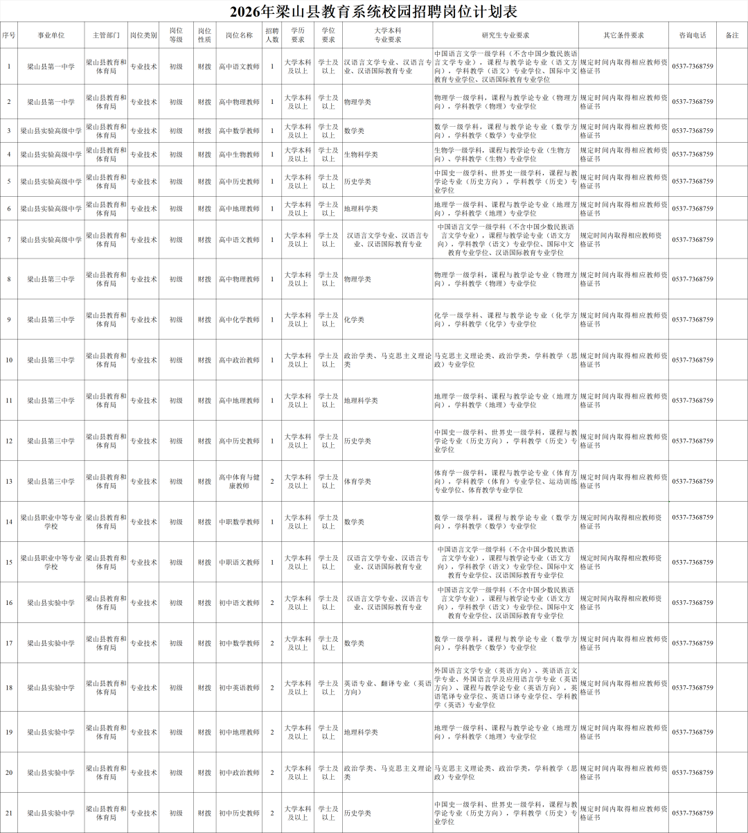 招聘相关信息均在梁山县人民政府网站发布,咨询电话:0537-7368759。