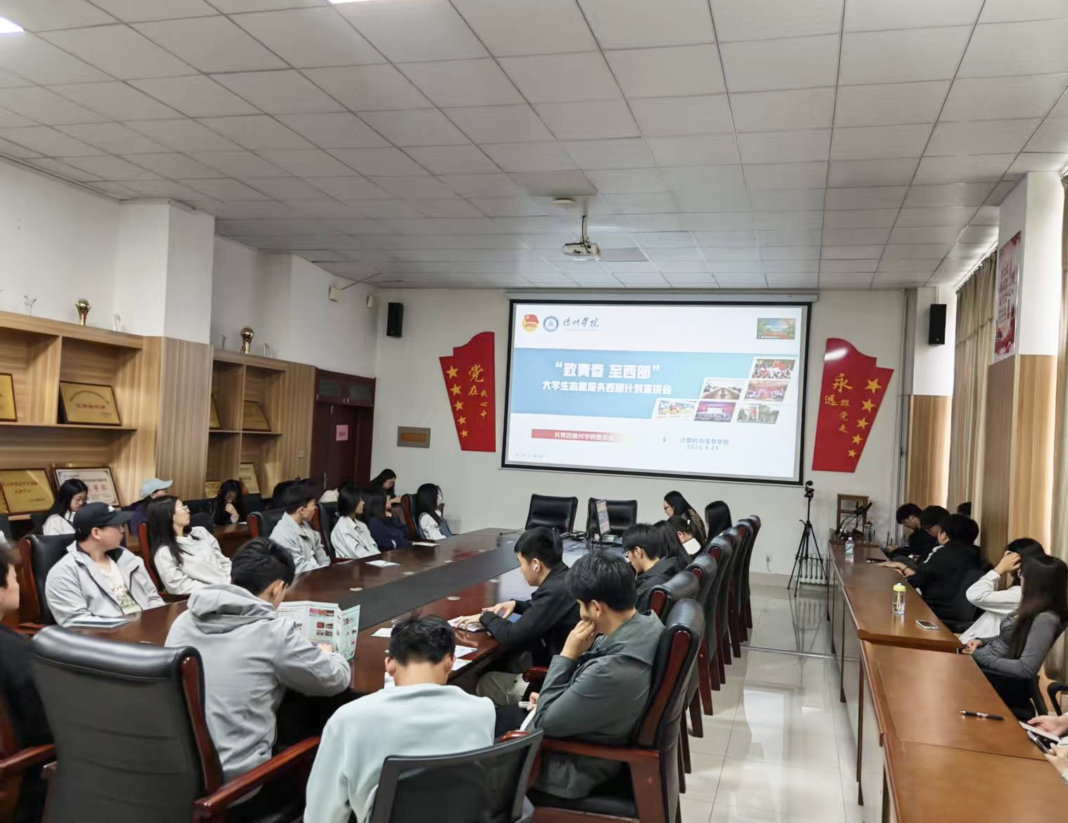 为深入贯彻落实大学生志愿服务西部计划相关工作部署,引导青年学子厚植家国情怀、勇担时代使命,积极投身西部建设和基层发展实践,4月21日下午,由计算机与信息学院承办的“青春西行,筑梦山河——大学生志愿服务西部计划宣讲会”在东校区明理楼0326会议室举行。本次活动特邀计算机与信息学院2025届参与西部计划的优秀志愿者刘景泰进行分享,学院团委书记侯新颖担任主讲,全校各学院有意向参与西部计划的学生到场聆听。
